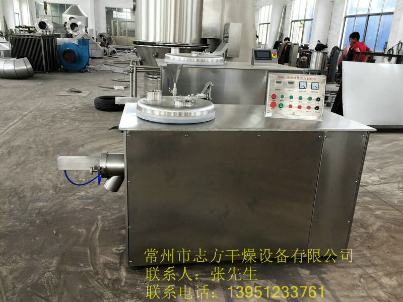 粉體物料與粘合劑在圓筒形容器中由底部混合漿充分混合成濕潤軟材,然后由側置的高速粉碎槳切割成均勻的濕顆粒。