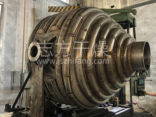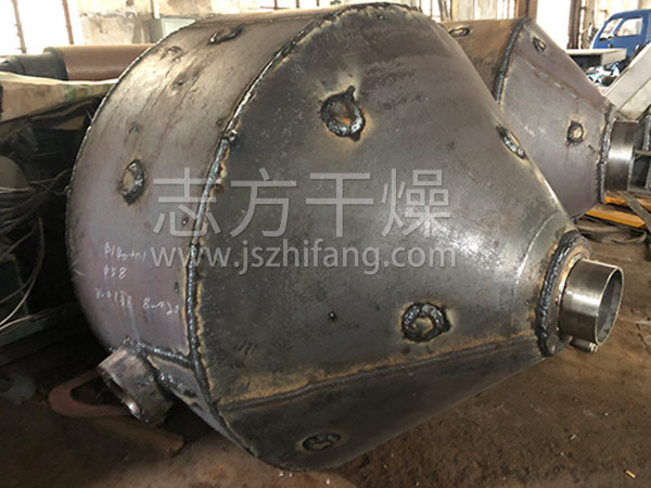 目前干燥機械行業制造雙錐回轉干燥機時普遍使用夾套加熱裝置。但是其具有受熱不均勻的缺點,加熱介質難以進入部分夾套死角區域,影響產品質量和產量。加熱介質容易在夾套內結垢。加熱介質會因重力問題產生加熱偏向并引起熱利用率低的問題。另外夾套加熱裝置屬于壓力容器,對使用場所和后期維護會有所限制。夾套加熱裝置由鐵板與不銹鋼板焊接而成,材料膨脹系數不同,長時間使用有容易滲漏的缺點。