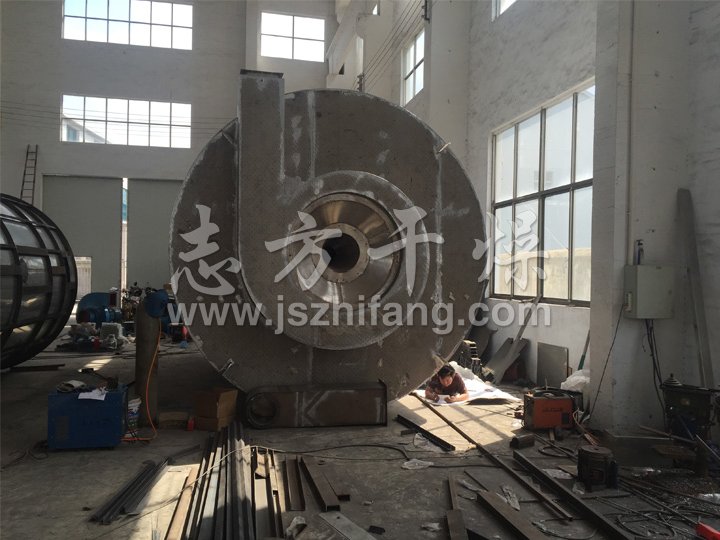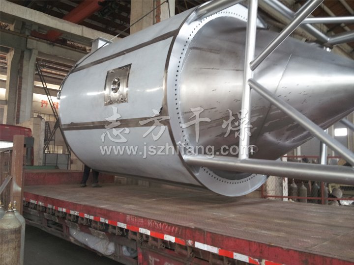 空氣經過濾和加熱,進入干燥器頂部空氣分配器,熱空氣呈螺旋狀均勻地進入干燥室。料液經塔體頂部的高速離心霧化器,(旋轉)噴霧成極細微的霧狀液珠,與熱空氣并流接觸在極短的時間內可干燥為成品。成品連續地由干燥塔底部和旋風分離器中輸出,廢氣由風機排空。