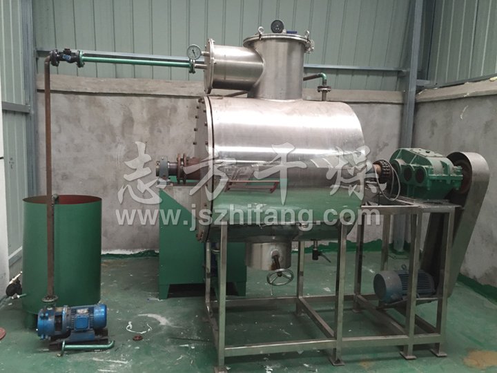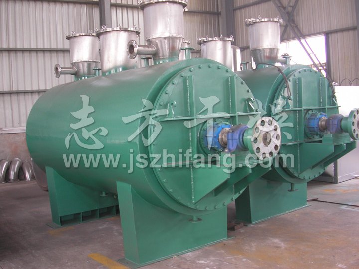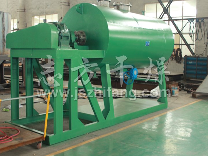 本機是一種新穎臥式間歇式真空干燥設備,濕物料經傳導蒸發,帶有刮板攪拌器不斷清除熱面上的物料,并在容器內推移形成循環流,水份蒸發后由真空泵抽出。
