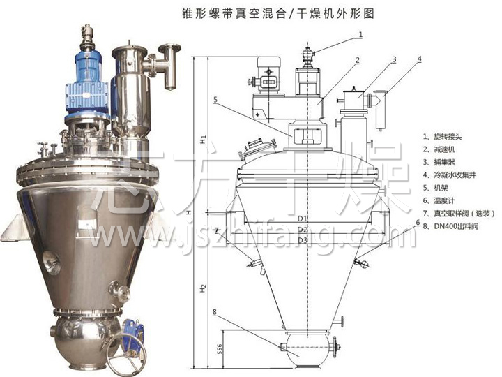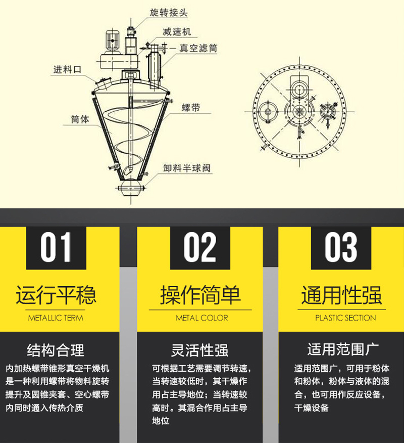 錐形螺帶混合真空干燥機是一種適用于干燥粉末,顆粒,糊狀物和粘性漿狀物的通用批量干燥器,特別是當產品對熱敏感,含有有毒溶劑或易爆時使用。 錐形螺帶混合真空干燥機能夠處理在干燥過程中變得沉重和粘稠的產品。