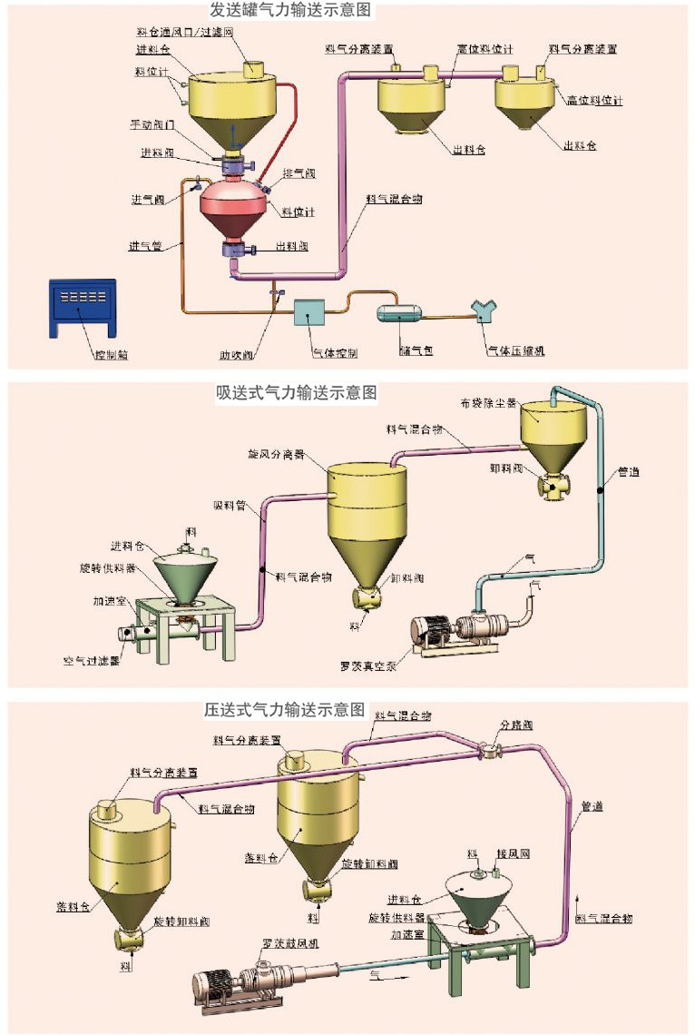 正壓和負壓也可進行組合應用以滿足特殊要求,比較適用于多點供料單點出料的輸送方式,通常為輸送粉狀、小顆?;虮戎剌^輕的物料。
