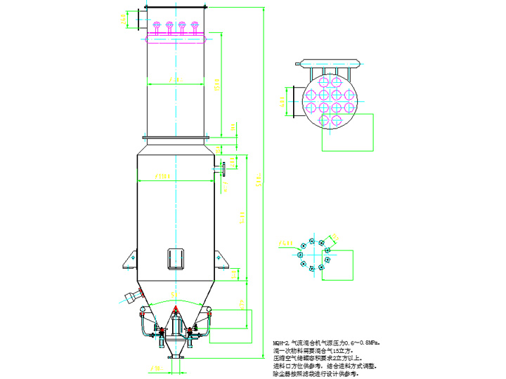 氣流混合機是利用壓縮空氣減壓后體積迅速膨脹的原理,將凈化后的壓縮空氣噴射入料倉底部,將粉體物料迅速推動、托起,設計壓縮空氣噴嘴的排列及角度,使倉內物料處于沸騰狀態,物料被全方位擴散實現快速混合。混合后的氣體經上方空氣過濾系統排出。