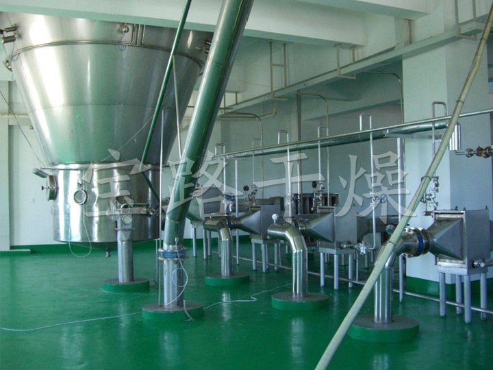 該生產線由供料系統、介質循環系統、空氣加熱凈化系統、干燥塔系統、收料系統、控制系統等多個系統整合而成。主塔系統集中了目前噴霧干燥工程的所有尖端技術,噴干機組的收料系統由一級旋風分離器+布袋除塵器組合形成。一級旋風采用高氣量高效率旋風進行收集,其收粉率能達到96%左右分,而布袋除塵器是針對蛋白粉類除塵專門設計的優化設備,能使物料與風進行完全分離并沉降,布袋為拒水防油防靜電布袋,過濾目數可達500目以上。